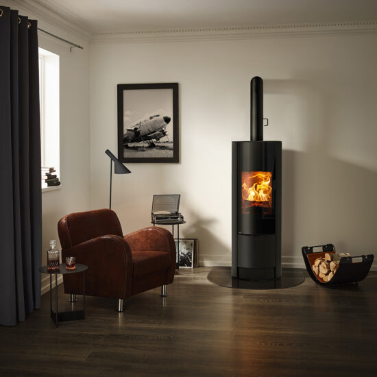 Seine klassische, runde Form ist modern interpretiert. Die große Panoramascheibe setzt das Feuer perfekt in Szene.